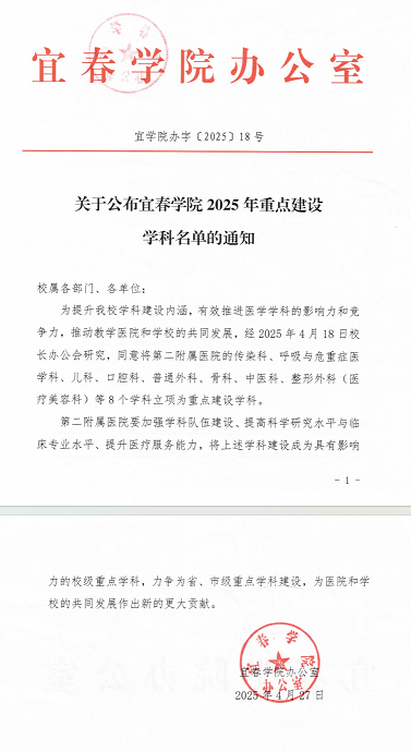4月27日,宜春学院第二附属医院(宜春市第六人民医院)收到了宜春学院的正式批复,同意医院传染科、呼吸与危重症医学科、儿科、口腔科、普通外科、骨科、中医科、整形外科(医疗美容科)等8个学科列为重点建设学科。此举标志着医院在学科布局优化、专科能力提升方面迈出关键步伐,进一步巩固我院作为宜春市及周边地区疑难重症诊疗中心的地位。