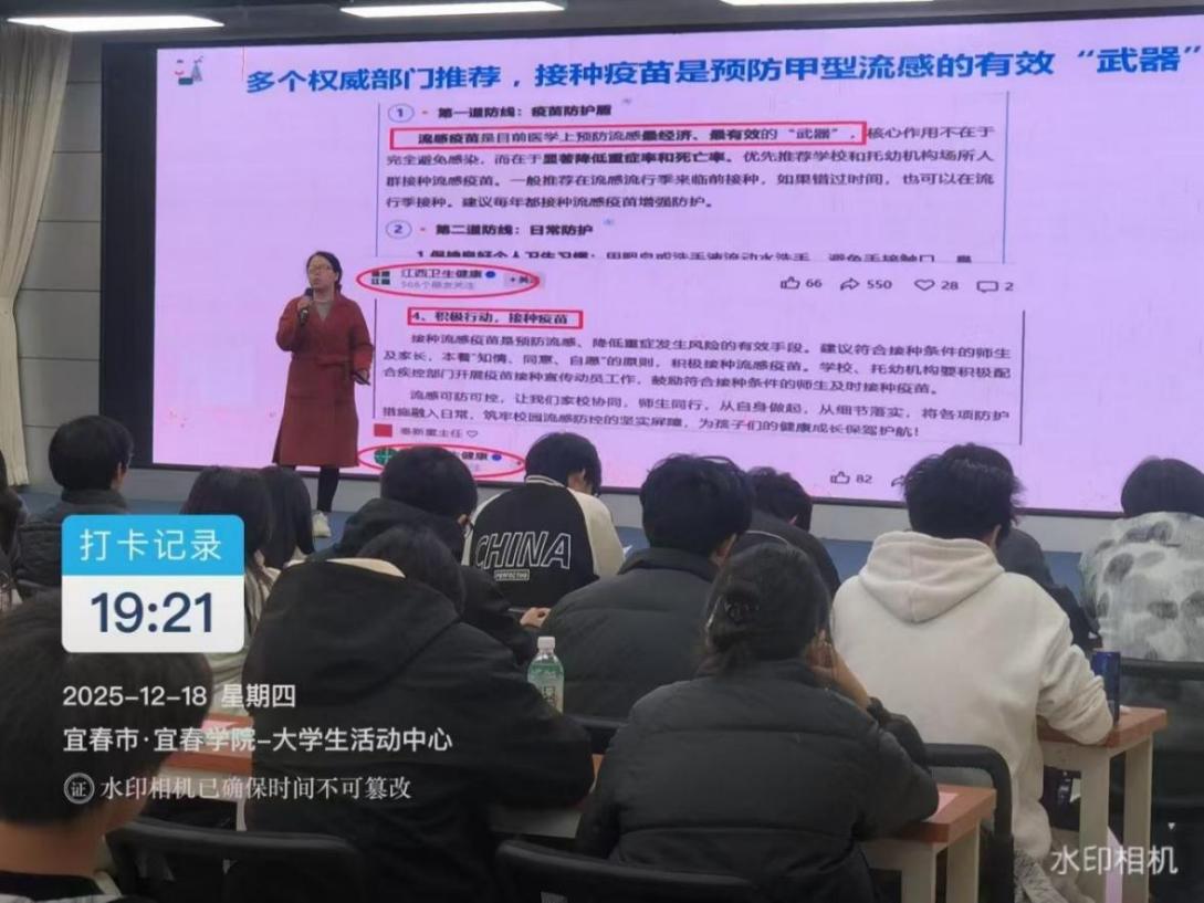 当晚,宜春学院社区卫生服务站(校医院)主任季筱红在大学生活动中心作《科学防控流感》专题分享,深入剖析了流感病毒特性、传播方式、典型症状及治疗的黄金时间。护士长钟会玲分享了《接种流感疫苗、筑牢免疫屏障》,指出接种流感疫苗是预防流感最有效、最经济、最可靠的手段。中医师易童带来了《一针疗法专题讲义》,阐释了以“一次一针一穴”为核心的治疗理念。