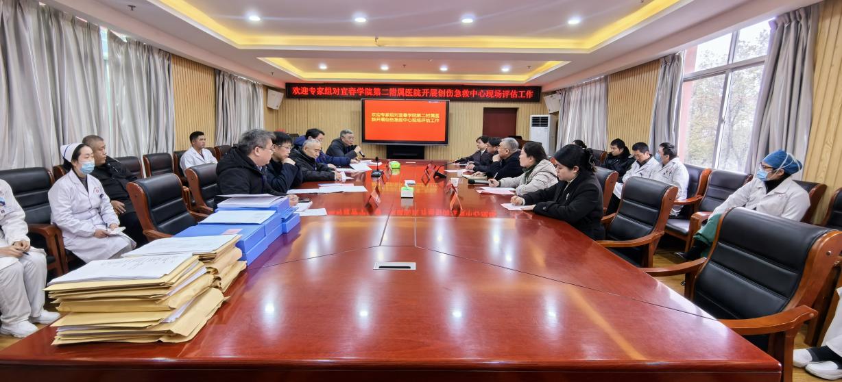 为持续完善创伤急救中心建设,全面提升创伤救治能力与水平,2026年1月21日上午,江西省创伤急救中心专家组莅临宜春学院第二附属医院,开展创伤急救中心创建现场评估工作。 评审专家组由南昌大学第一附属医院曾元临教授任组长,成员包括南昌大学第一附属医院黄学锋主任、新余市人民医院龚军主任、萍乡市人民医院文新远主任、宜春市人民医院曾勇主任。宜春学院党委委员、副校长黄诚,宜春市卫健委副主任刘灵灵、姚永龙,宜春市紧急救援中心副主任陈玉红、急救管理科科长叶勇,以及我院院长邱志宏、副院长邓添、彭芳和相关科室负责人参加此次评估会议。会议由副院长邓添主持。
