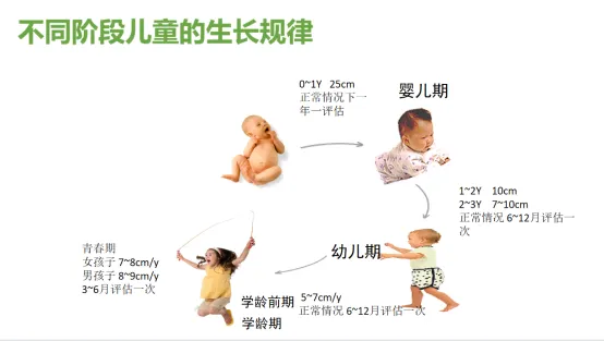 二、儿童生长发育的规律 儿童生长发育是有规律的,各年龄阶段的生长速率不同,3岁以内是生长快速期,孩子第一年长25cm,第二年长10cm左右;3岁至青春期前期每年长高5-8cm;第二个生长高峰期是青春期,女孩10-11岁,男孩12-13岁进入青春期,身高增长25-30cm左右。每个阶段的生长都对成年后的最终身高起到一定的影响,生长速率在某一时间段的不足,会造成身高落后,最终可能导致身材矮小。 |