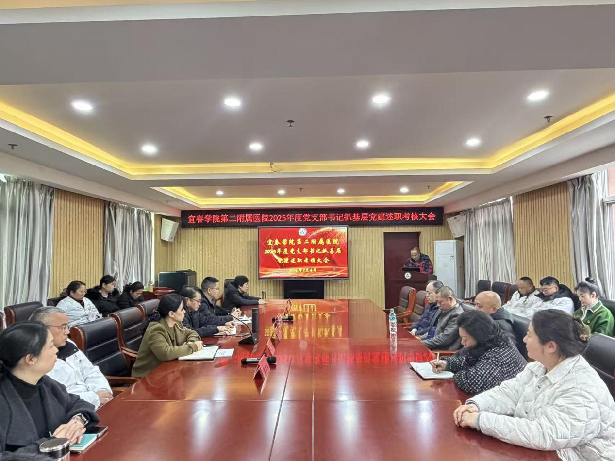 为压实基层党建责任,强化党员队伍建设,推动党建与业务深度融合,2026年2月4日下午,宜春学院第二附属医院近日召开2025年度党支部书记抓基层党建述职考核大会。院党委班子成员、各支部书记及全体党员参加会议,会议由党委委员、副院长邓添主持。 会议开始,副院长邓添强调,此次述职考核是检验支部书记履职成效、提升基层党建水平的重要举措,希望通过述职复盘、交流提升,切实筑牢党建工作根基,为医院稳步发展凝聚红色力量。