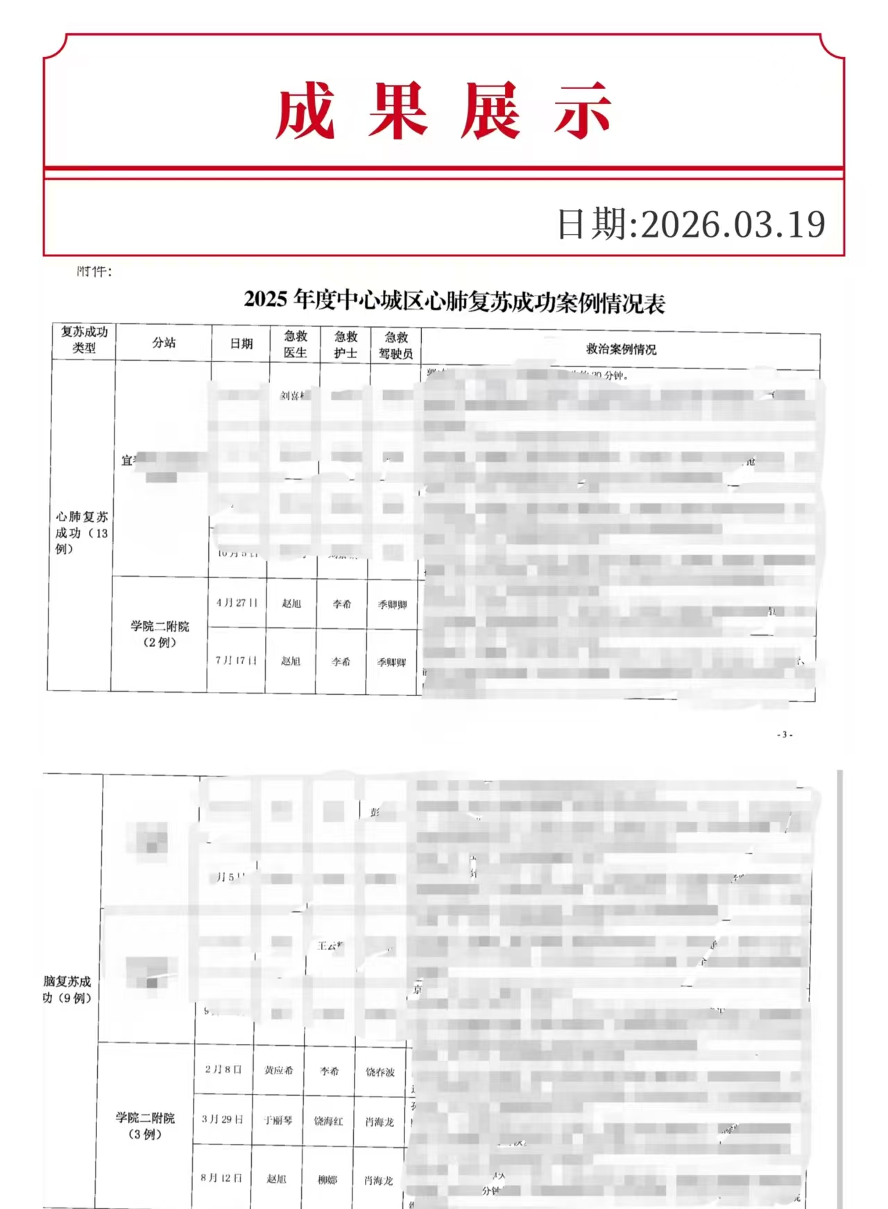 生命奇迹,心肺复苏成功案例领跑 在同期发布的《关于2025年度中心城区各急救分站心肺复苏成功案例的通报》中,我院急救分站更是交出了亮眼答卷:全年共成功完成5例心肺复苏,其中脑复苏成功3例,心肺复苏成功率位居全市前列,充分彰显了我院急救队伍过硬的专业素养与高效的团队协作能力。 通报附件的成功案例详情里,赵旭、李希、柳娜、肖海龙等同志的名字赫然在列,他们在面对心跳呼吸骤停的危重患者时,争分夺秒开展胸外按压、电除颤等规范救治,成功为患者挽回生命,创造了生命的奇迹。
