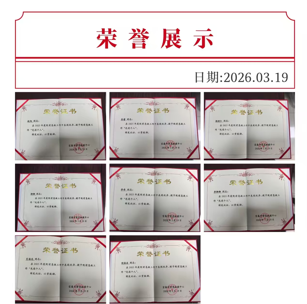 近日,宜春市紧急救援中心发布通报,宜春学院第二附属医院急救分站多位医护人员在2025年度院前急救工作中斩获多项荣誉,用专业与担当书写了生命守护的新篇章。 先进引领,获评多个优秀 在2026年3月19日召开的 《2026年度中心城区院前救急工作会议》上,宜春学院第二附属医院急救分站凭借出色的工作表现,获得宜春市紧急救援中心领导高度赞扬。同时,分站多位同志荣获“先进个人”称号: 急救医生:赵旭、易蕾、杨树仁 急救护士:李希、柳娜 急救驾驶员:饶春波、季卿卿、肖海龙 这份荣誉,是对我院急救团队全年坚守岗位、高效履职的高度肯定,更是对全体急救人员“人民至上、生命至上”理念的生动践行。